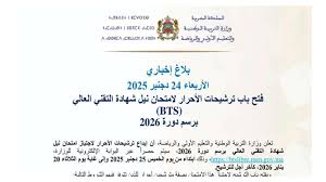 أعلنت وزارة التربية الوطنية والتعليم الأولي والرياضة عن بدء عملية إيداع ترشيحات الأحرار لاجتياز امتحان شهادة التقني العالي (BTS) لدورة 2026