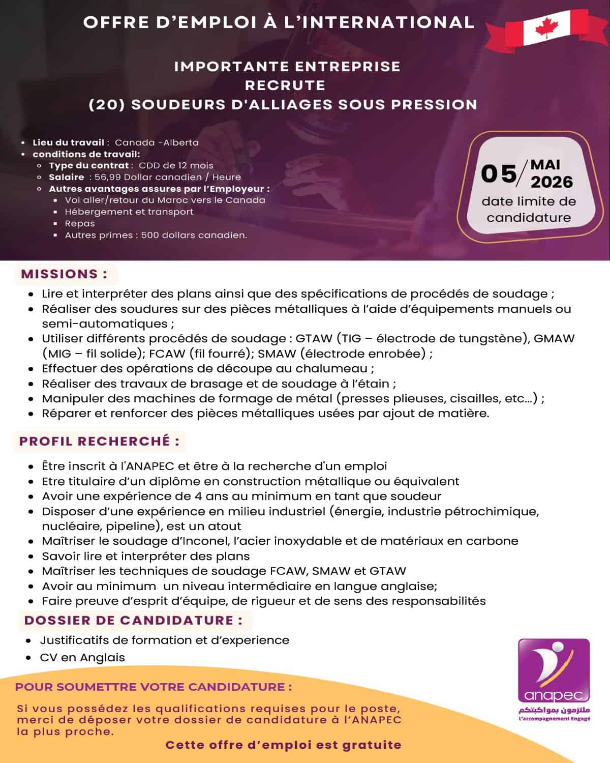 Une entreprise recrute 20 soudeurs d’alliages sous pression au Canada, en Alberta, en CDD de 12 mois. Une entreprise de travaux forestiers recrute également 4 bûcherons ouvriers forestiers en France, en CDI. Les postes s’adressent à des profils qualifiés, disponibles pour une mobilité internationale et inscrits à l’ANAPEC.