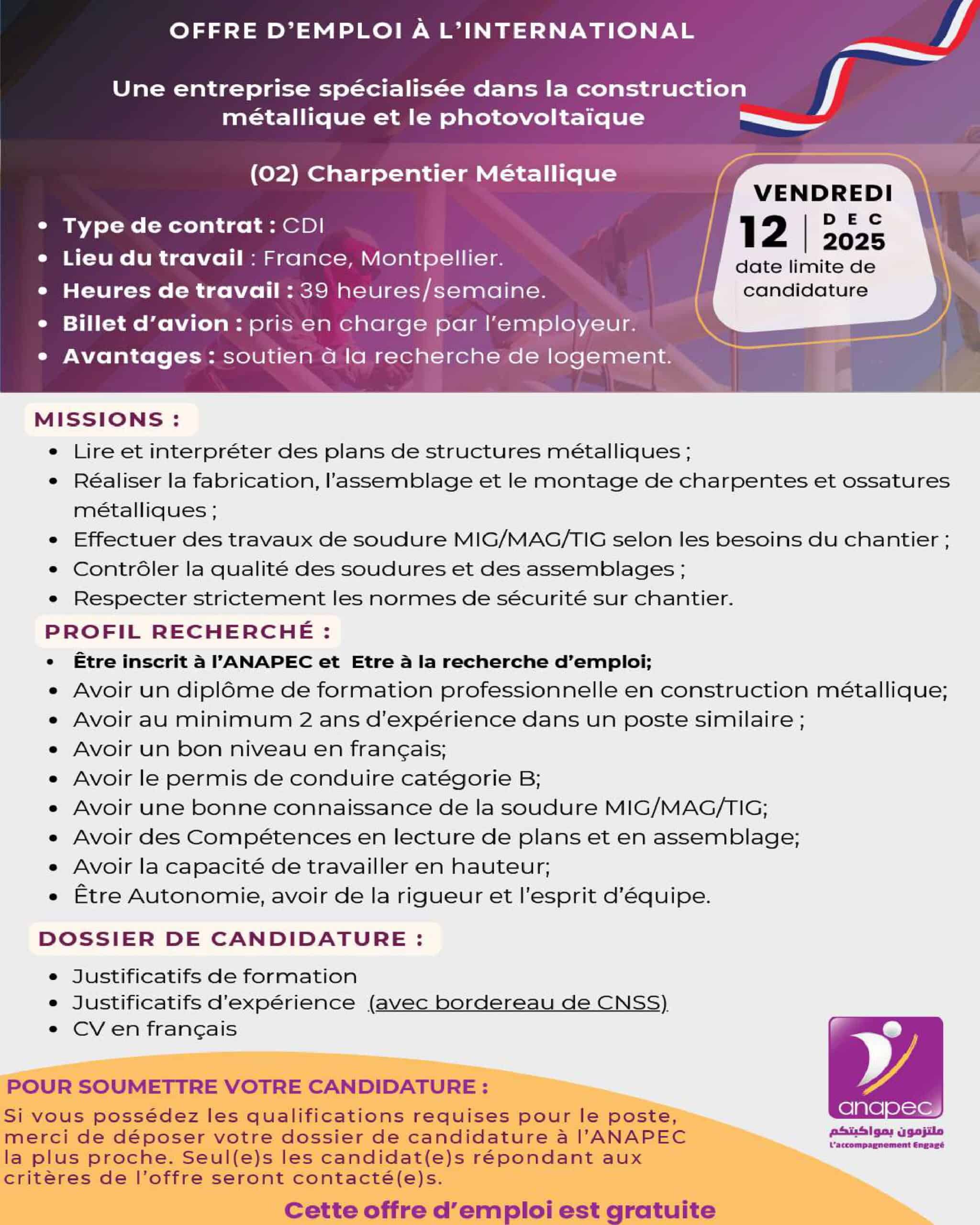 Une entreprise spécialisée dans la construction métallique et le photovoltaïque recrute plusieurs profils pour des contrats CDI à Montpellier, France. Ces postes sont destinés aux professionnels qualifiés souhaitant évoluer dans un environnement structuré avec un accompagnement dédié pour l’installation et la prise de poste.