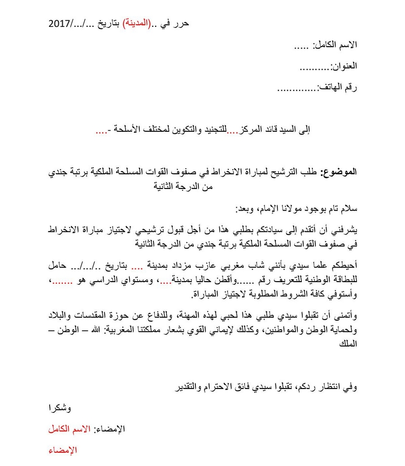 يشرفني أن أتقدم إلى سيادتكم بهذا الطلب من أجل قبول ترشيحي لاجتياز مباراة الانخراط في صفوف القوات المسلحة الملكية برتبة جندي من الدرجة الثانية